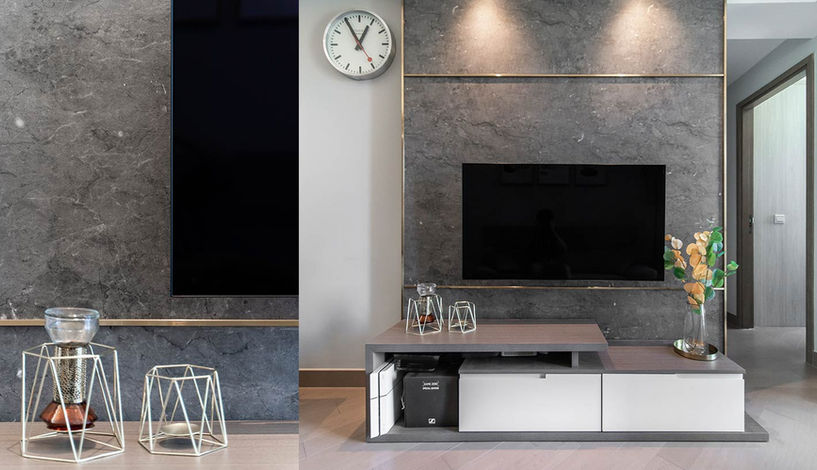 深灰色雲石紋防花 板配上金色拉絲鋼材的點綴, 讓單調的電視牆變成整個客飯廳的焦點。